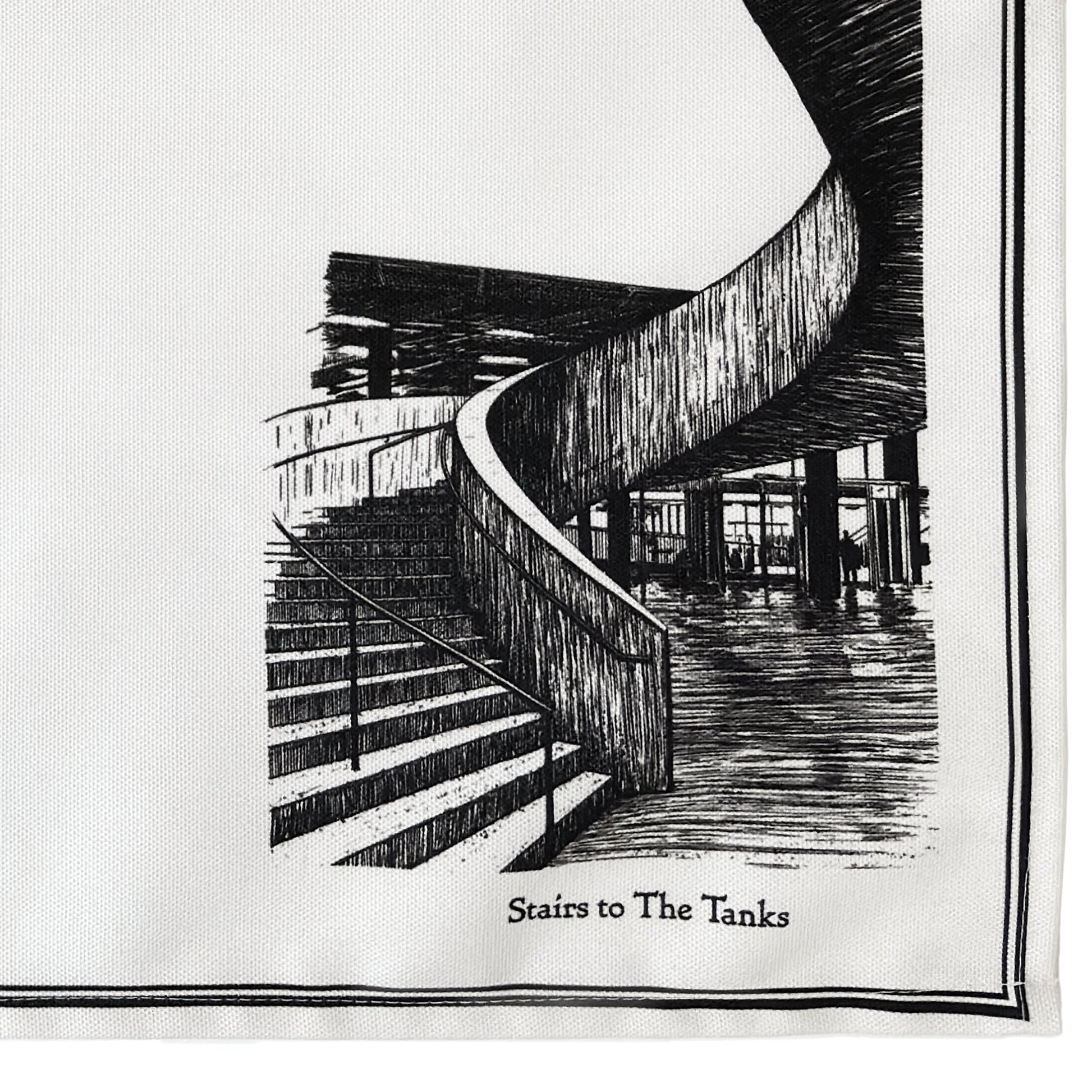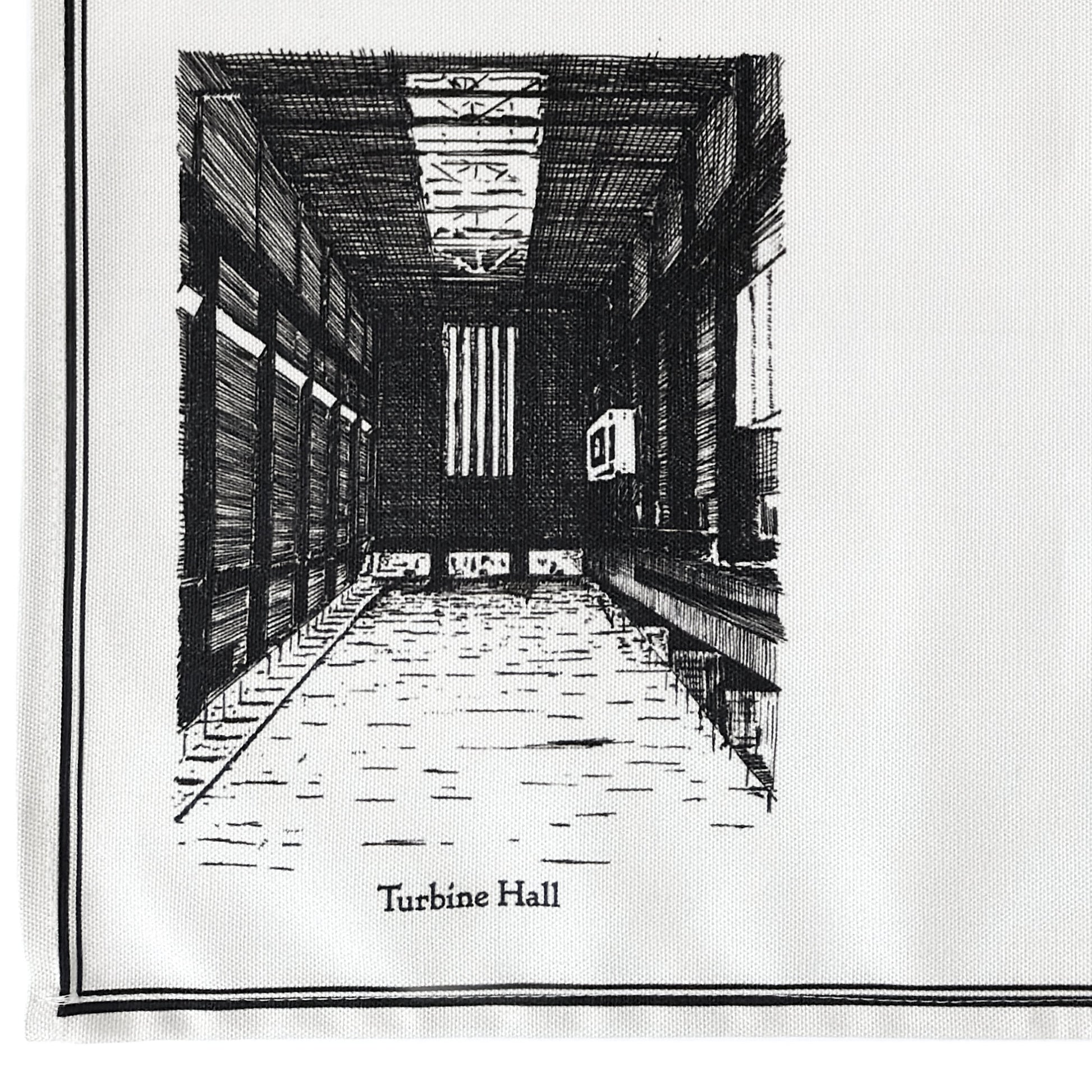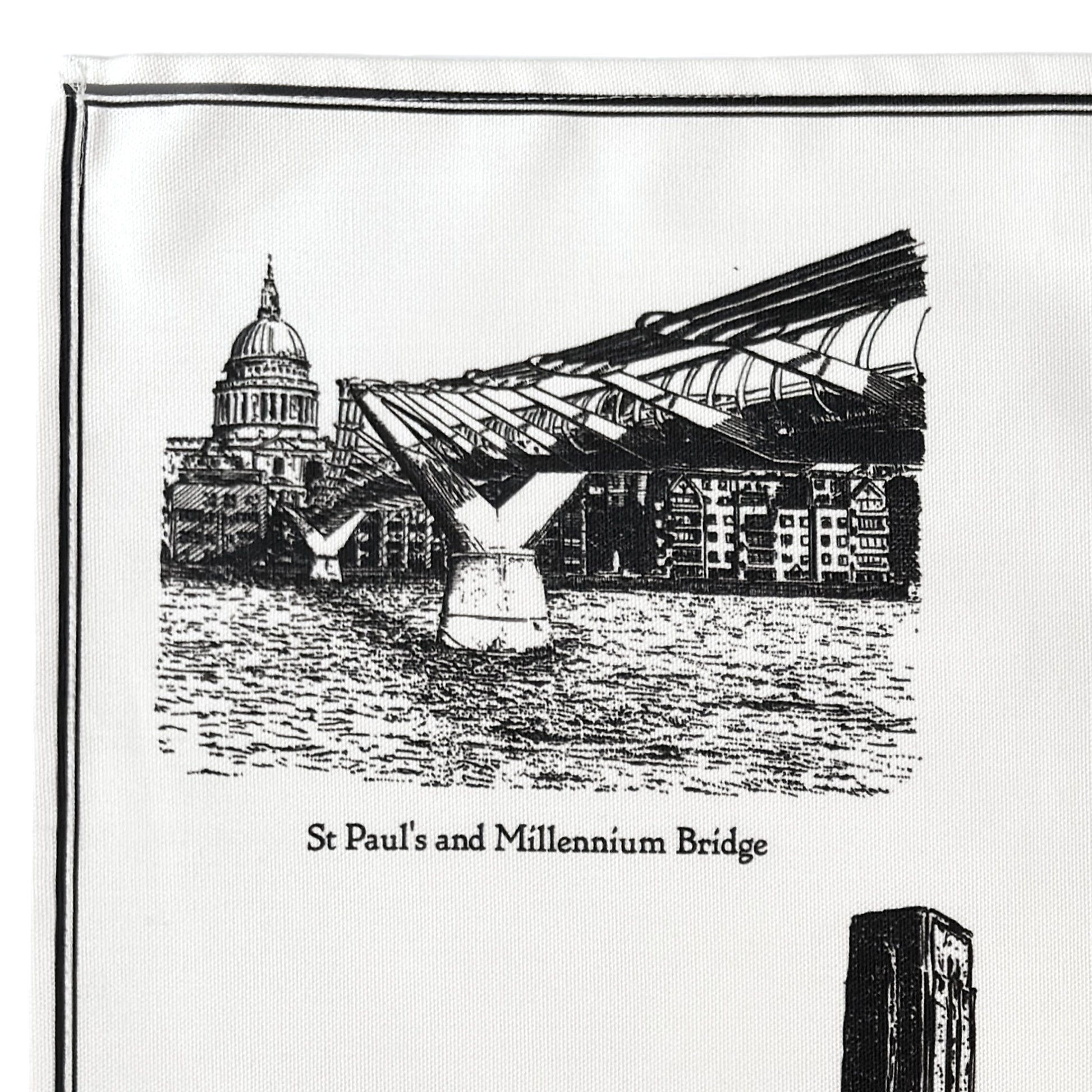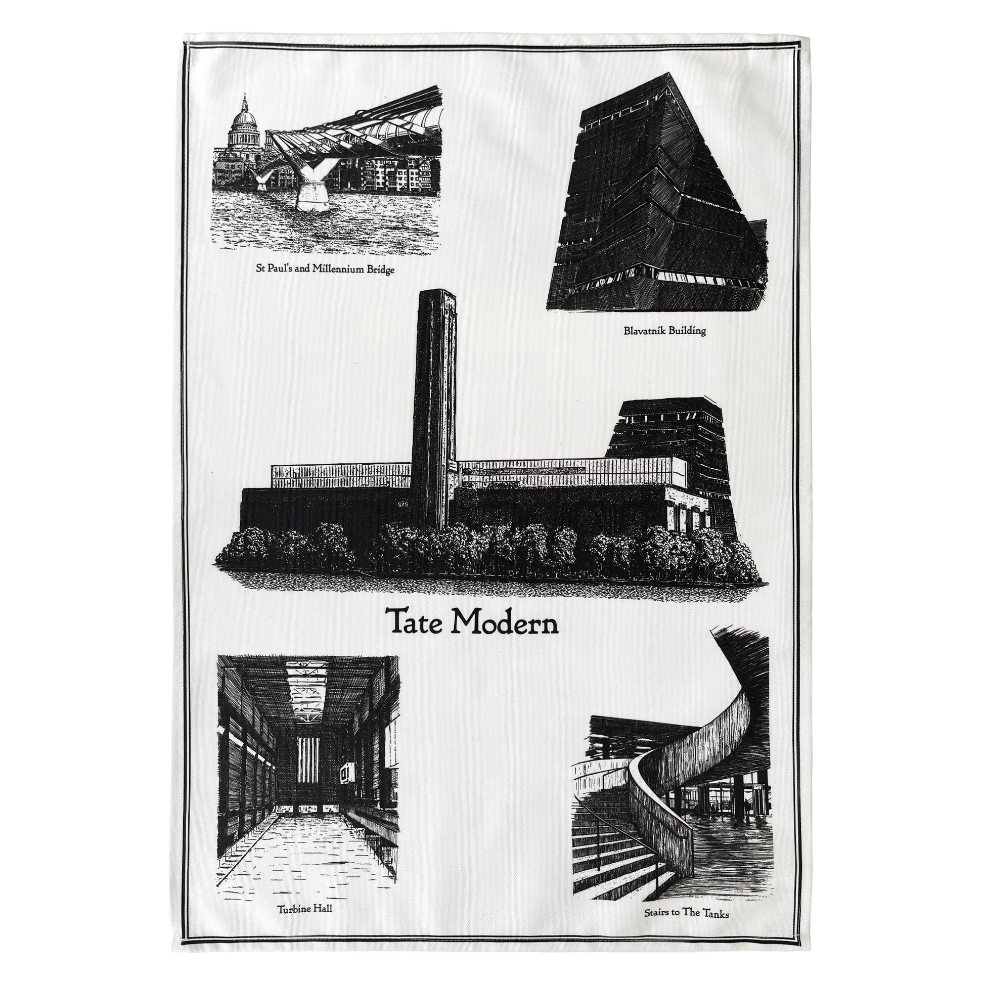 Pen and ink drawings of Tate Modern including the Blavatnik Building and Millennium Bridge with St Paul’s Cathedral. Printed white on a black background using Oeko-Tex Standard 100 certified inks. Each tea towel is individually made, with slight variations in size, placement and stitching. A small barcode is printed on the reverse hem as part of production.